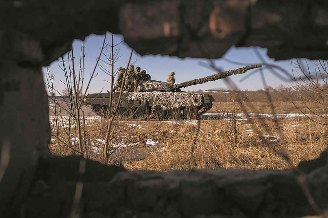 2月23日,乌克兰哈尔科夫,第三独立坦克铁桥的乌克兰军人在演习中乘坐坦克,这是俄乌冲突一周年的前一天 视觉中国供图