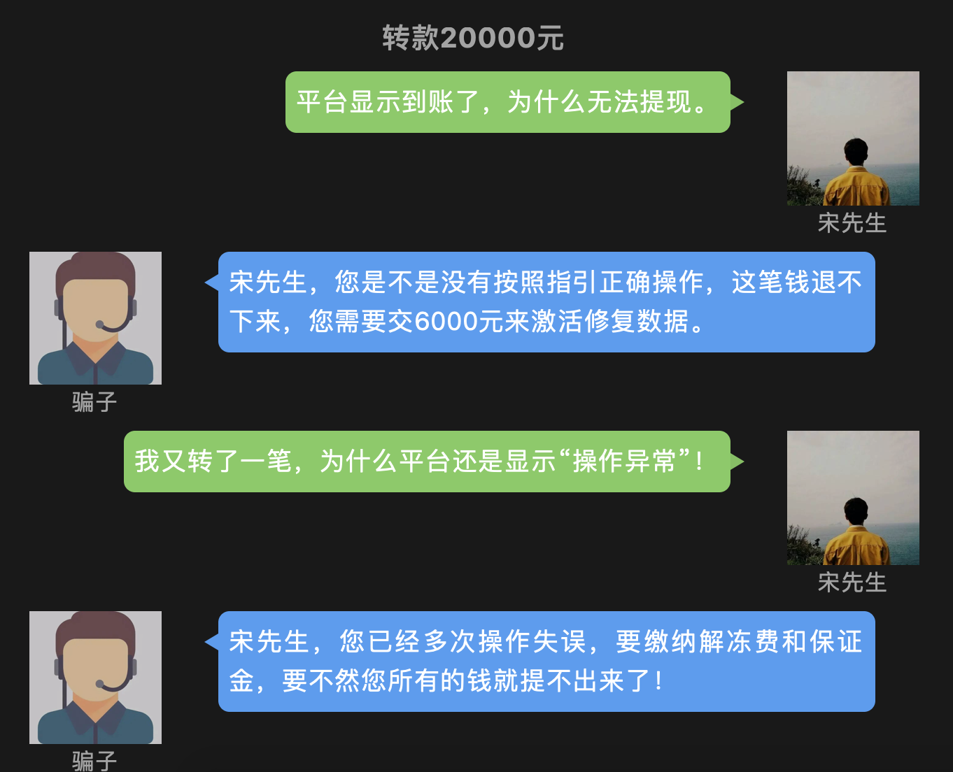 转账2万元后,宋先生发现,平台显示到账,却无法提现了。这时对方称宋先生操作失误,这笔钱退不了,需要交6000元来激活修复数据。宋先生照做后,平台仍显示“操作异常”。对方又称宋先生多次操作失误,要缴纳解冻费和保证金。宋先生再次转账仍不能提现,这才意识到自己被骗,急忙报警。