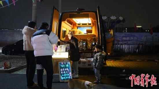 而开着房车去各地摆摊,对于苏成功来说,不只是工作,也是生活,用他的话说,是“不负热爱”。2月10日晚,在北京东边的日落集市,毛驴咖啡摊位前围满了人,1分钟内有多个顾客下单。今年,随着苏成功表妹的加入,摊位上又多了奶茶。