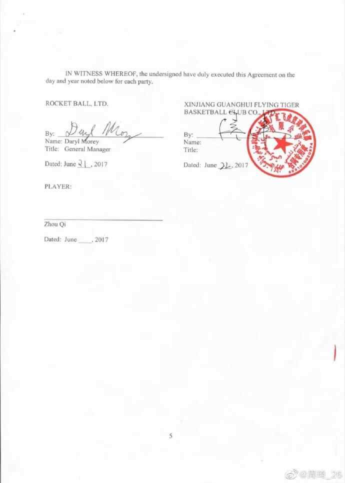 直到7月,根据NBA要求,我与火箭队、广汇俱乐部三方签署了英文版的买断协议,买断协议明确约定,火箭队向广汇俱乐部支付65万美金买断费,合同生效之日起,之前我与广汇俱乐部签署的任何球员合同全部解除。
