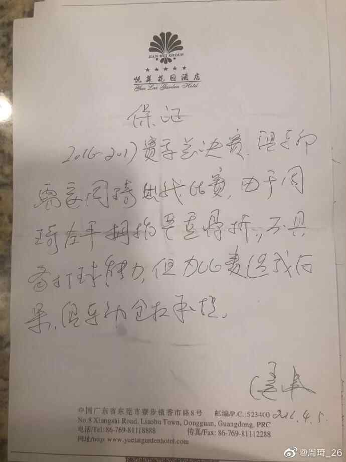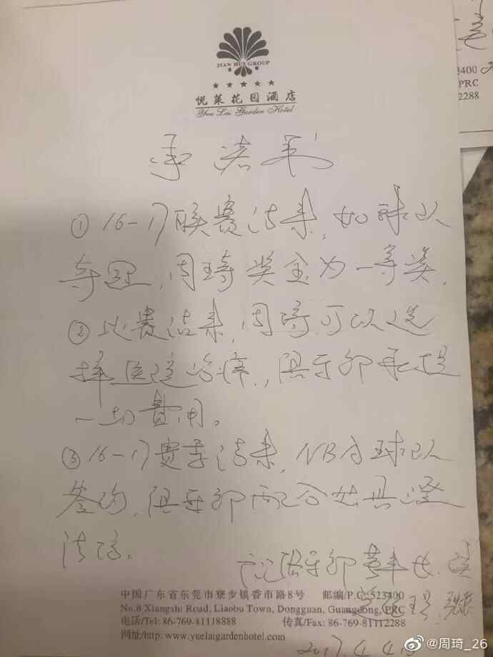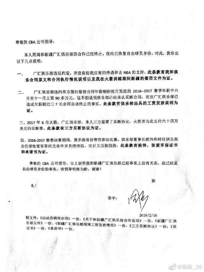 同年5月,我前往休斯顿接受手指骨折的治疗,期间与火箭队达成签约意向,广汇俱乐部侯伟在得知此事后,继续出尔反尔,要挟我家人以必须先同意“从NBA回国后必须承诺在广汇俱乐部继续打五年”,才会给开具澄清信。而当时我认为侯伟已经给我写过了保证开具澄清信的书面承诺,而且我人已经在美国,就没有再和他签署任何文件。