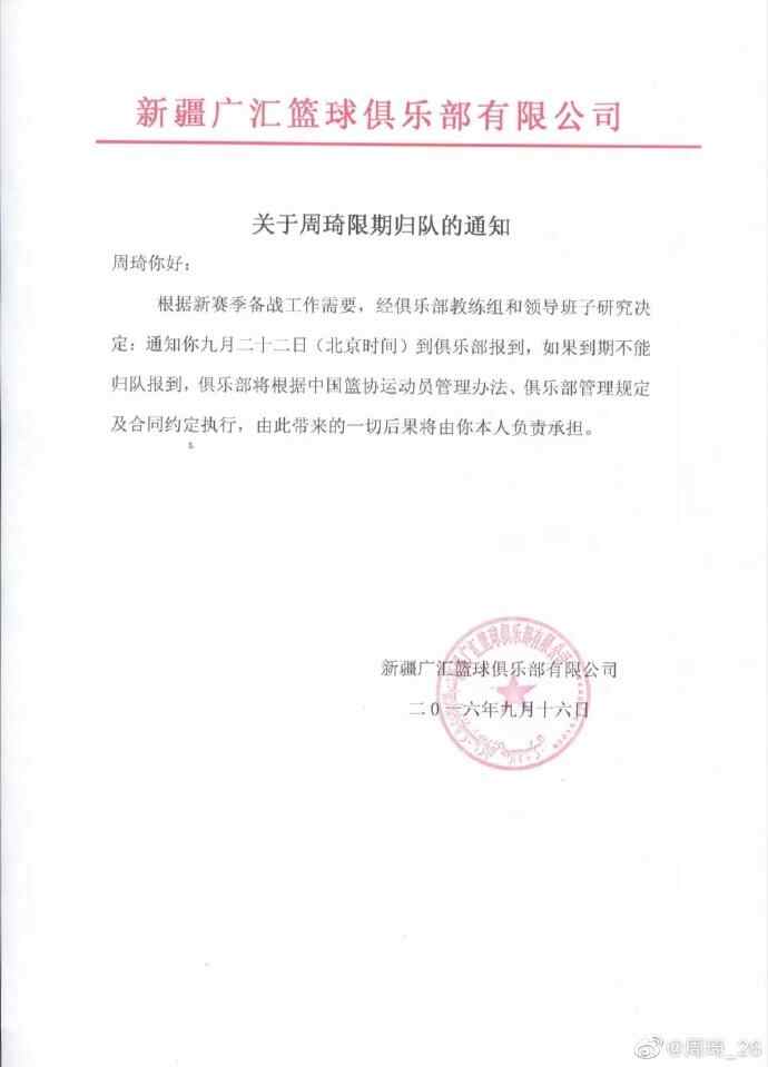 然而,2016年我宣布参加NBA选秀,我需要广汇俱乐部出具澄清信支持我参加NBA选秀,时任俱乐部董事长的侯伟却以合同不是他本人签字为由拒绝为我出具澄清信。紧接着,2016年9月,当我在参加火箭队训练营期间,广汇俱乐部向我发出了“要求我限期归队”的处罚文件(图一),当时广汇这个行为严重干扰了我与火箭队谈判的进程。