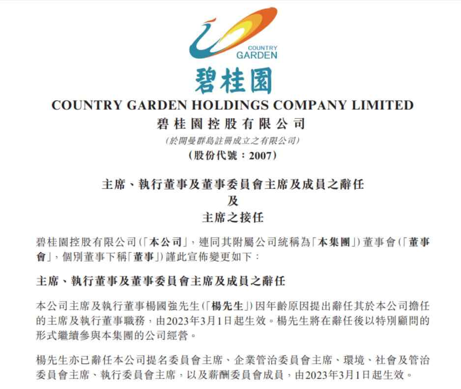 3月1日早间,碧桂园在港交所公告,公司主席及执行董事杨国强因年龄原因提出辞任其于本公司担任的主席及执行董事职务,由2023年3月1日起生效。杨国强将在辞任后以特别顾问的形式继续参与本集团的公司经营。
