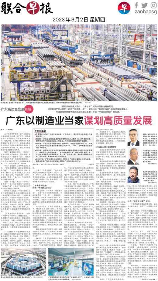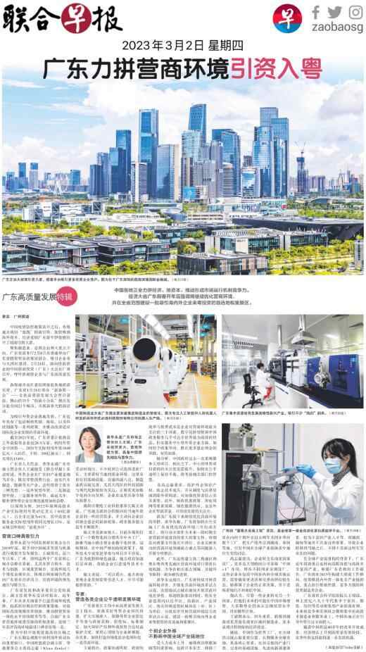 3月2日,新加坡《联合早报》推出两个整版报道聚焦广东高质量发展。两篇报道《广东以制造业当家谋划高质量发展》《广东力拼营商环境引资入粤》,分别聚焦“制造业当家”“营商环境建设”两大议题,深度分析高质量发展的广东路径,认为广东作为中国经济大省、制造业大省,其实践具有探路和样本意义。