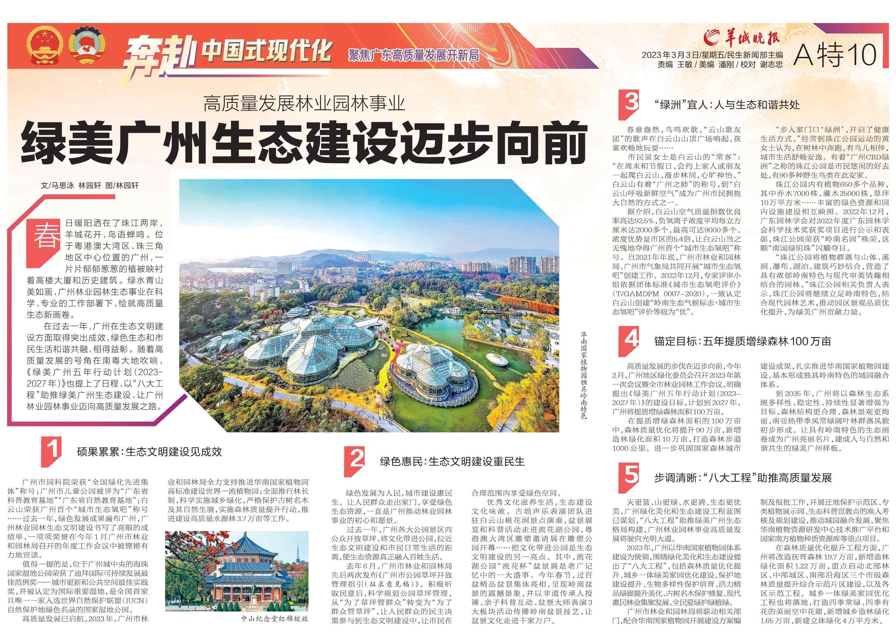 在过去一年,广州在生态文明建设方面取得突出成效,绿色生态和市民生活和谐共融、相得益彰。随着高质量发展的号角在南粤大地吹响,《绿美广州五年行动计划(2023-2027年)》也提上了日程,以“八大工程”助推绿美广州生态建设,让广州林业园林事业迈向高质量发展之路。