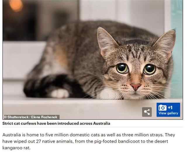 据了解,澳大利亚拥有500万只家猫和300万只流浪猫。这些猫大量猎杀本地动物。有27种本地动物已经灭绝,譬如豚足袋狸、荒漠袋鼠等。