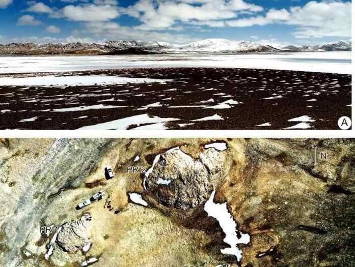 西藏阿里拉竹龙-邦达错地区兽形湖附近野外照片和中泥盆世点礁鸟瞰图。 南古所 供图