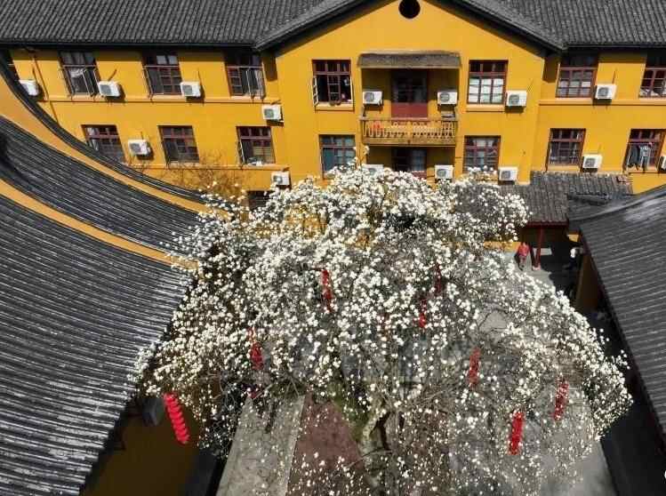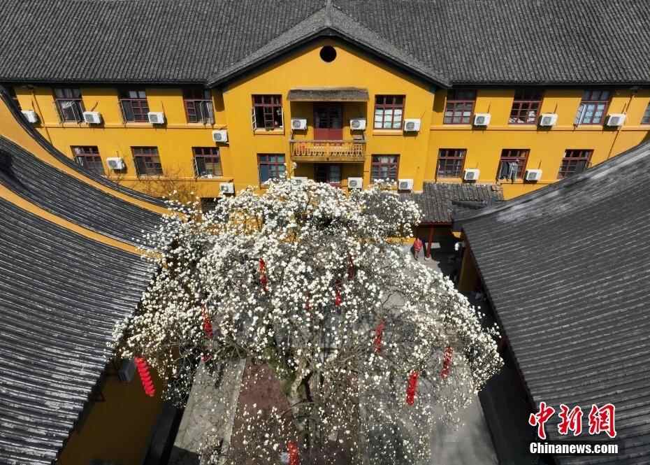 3月6日,航拍法喜寺院内的玉兰树。近日,浙江杭州千年古刹法喜寺院内,一棵有着500年左右树龄的玉兰树开花,独木成景吸引游人。(无人机照片)(中新社记者 王刚 摄)