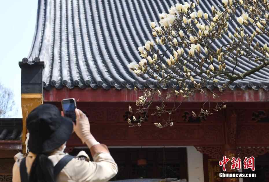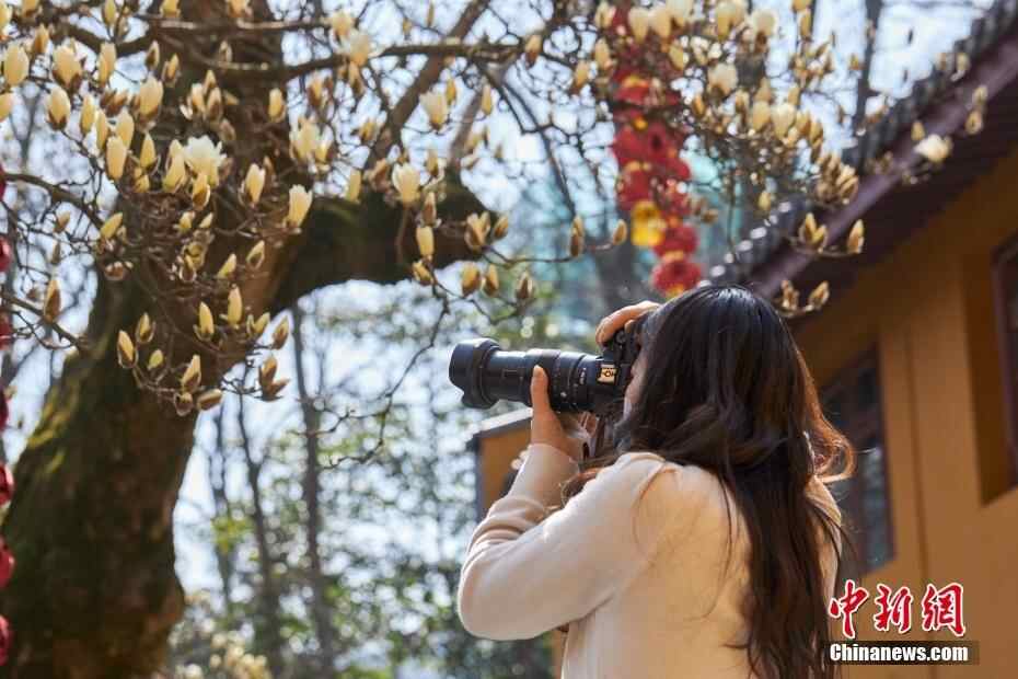 3月6日,游人拍摄绽放的玉兰花。近日,浙江杭州千年古刹法喜寺院内,一棵有着500年左右树龄的玉兰树开花,独木成景吸引游人。(中新社记者 王刚 摄)