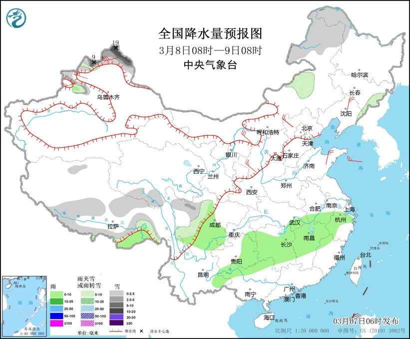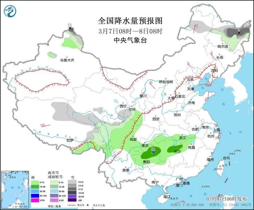 3月7日08时至8日08时,新疆北部、内蒙古东北部、黑龙江东北部和中部、西藏北部和东部、青海南部、甘肃南部、川西高原北部等地的部分地区有小到中雪或雨夹雪,其中,黑龙江东北部、新疆阿勒泰等地的部分地区有大雪,局地有暴雪(10~11毫米);西藏东南部、四川盆地中西部、重庆南部、贵州、湖南北部、湖北南部、江西西北部、云南东北部等地的部分地区有小到中雨,局地有大雨(25~30毫米)。内蒙古中东部、辽东半岛、山东半岛、浙江东部等地的部分地区有4~6级风(见图1)。