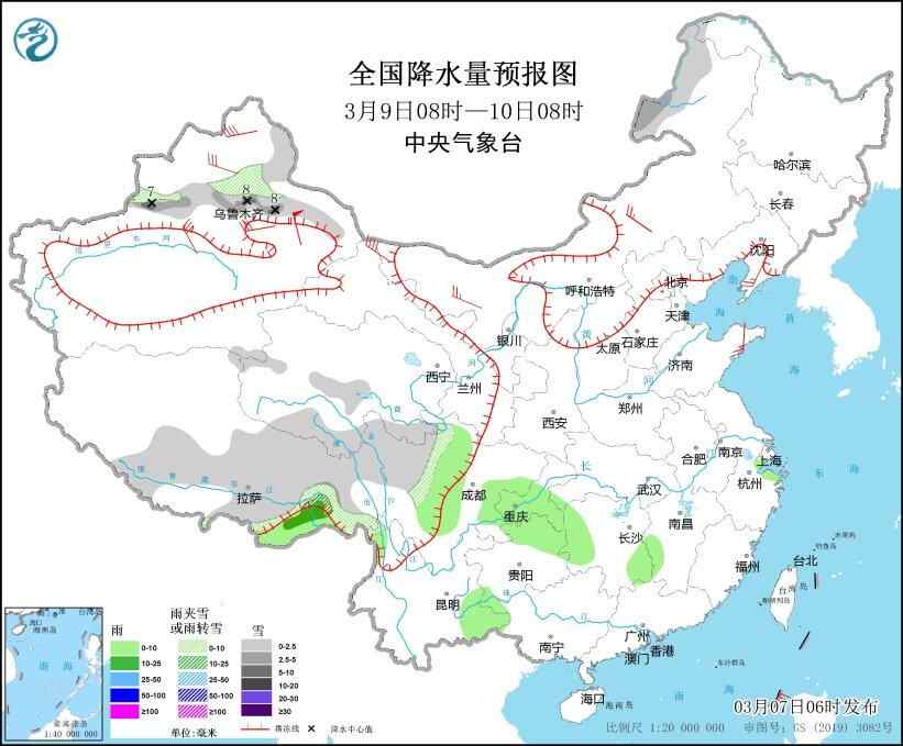 3月9日08时至10日08时,新疆沿天山地区、内蒙古东北部、西藏南部和东部、青海南部、川西高原北部等地的部分地区有小到中雪或雨夹雪,局地有大雪(5~8毫米)。西藏东南部、四川盆地西部和南部、贵州北部、湖南西部和东南部、云南东南部等地的部分地区有小雨,局地有中雨。新疆北部、内蒙古中西部、辽东半岛、山东半岛等地部分地区有4~6级风,局地阵风可达7~8级(见图3)。