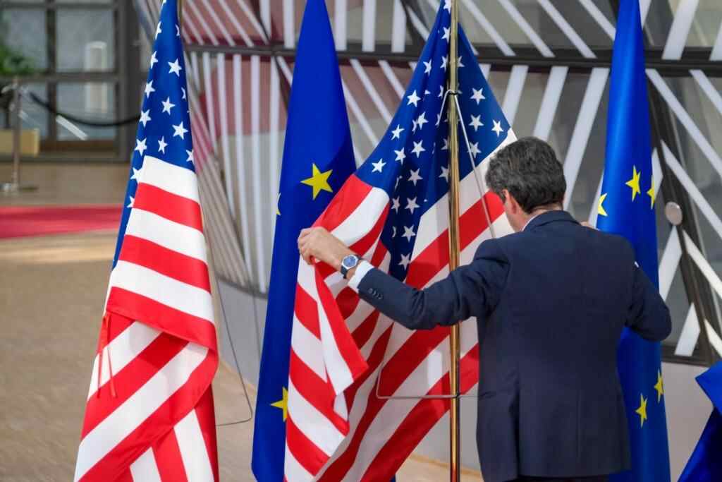 2022年3月24日,工作人员在比利时布鲁塞尔的欧盟总部整理美国国旗。(新华社记者张铖摄)