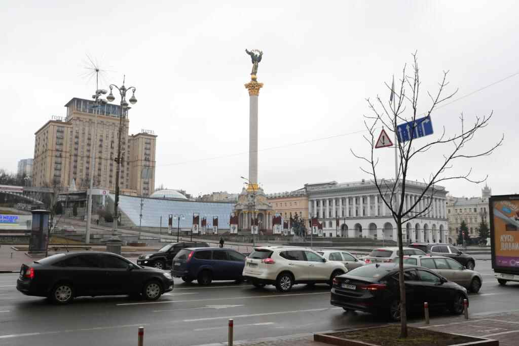 2022年2月24日,车辆从乌克兰基辅独立广场旁驶过。(新华社记者李东旭摄)