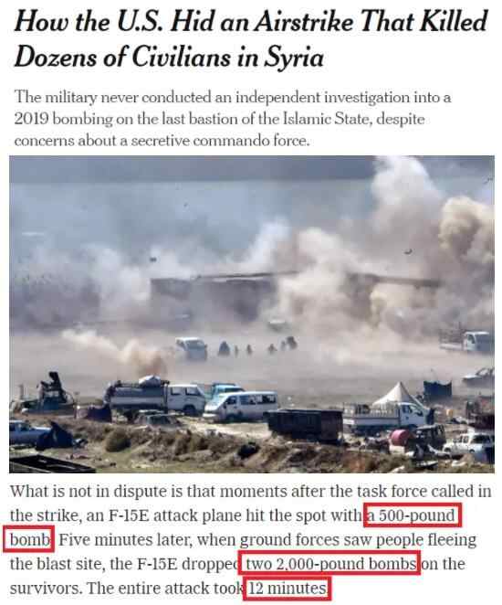 《纽约时报》题为《美国如何掩盖一场屠杀叙利亚平民的空袭》的文章披露称,美国空军曾于2019年3月18日出动无人机,在位于叙利亚与伊拉克边境的巴古兹镇投下约两枚2000磅的炸弹,炸死至少64名平民妇女和儿童。