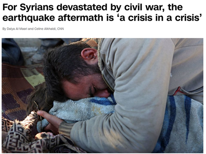 美国有线电视新闻网(CNN):这场地震对叙利亚来说是“危机中的危机”。联合国人道主义协调员呼吁各方把所有政治因素放在一边,把地震救援严格视为一个人道主义问题,“因为这关乎拯救生命”。