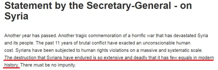 用联合国秘书长古特雷斯的话说,“叙利亚遭受的破坏如此广泛和致命,在现代历史上几乎没有哪个国家能与之相提并论”。