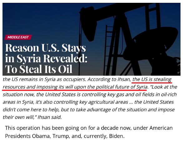 有欧洲媒体指出,美国在叙非法驻军的真正目的就是窃取当地资源,并将自己的意愿强加于叙利亚的政治未来。