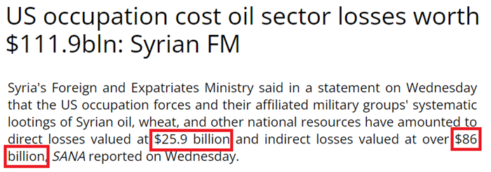去年底,叙利亚外交部致信联合国秘书长和安理会主席控诉说,美国非法驻军及其支持的叙反对派武装不断盗运叙石油等资源并破坏叙基础设施,已给叙造成259亿美元的直接经济损失以及860亿美元的间接经济损失。