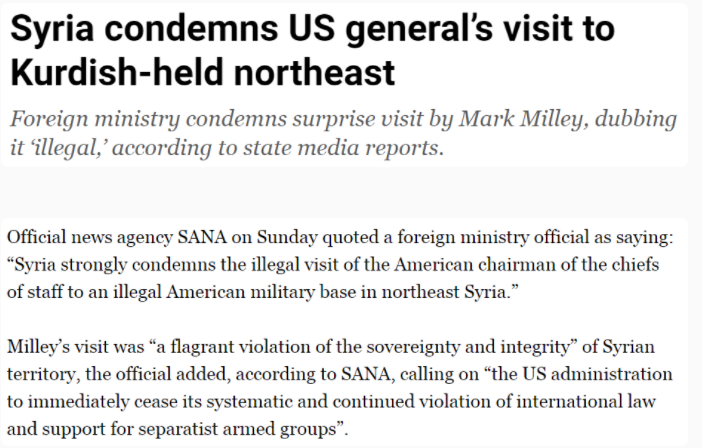 值此敏感时点,美军参谋长联席会议主席马克·米利却对美国在叙非法驻军基地进行了一次事先保密的突访。