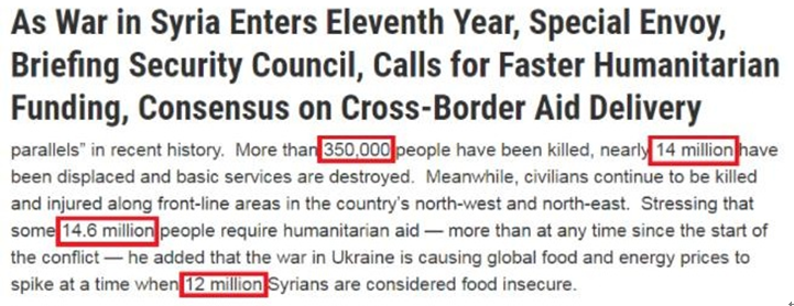 联合国数据显示,美国的干涉已造成叙利亚超过35万人丧生,近1400万人流离失所,1460万人急需人道主义援助,1200万人面临饥饿威胁。