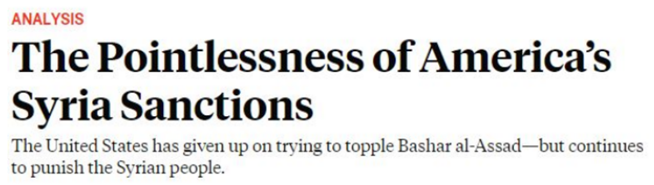 美国《外交政策》杂志:美国已经放弃了试图推翻叙利亚政府的努力,却仍在继续惩罚叙利亚人民,这样的制裁毫无意义。