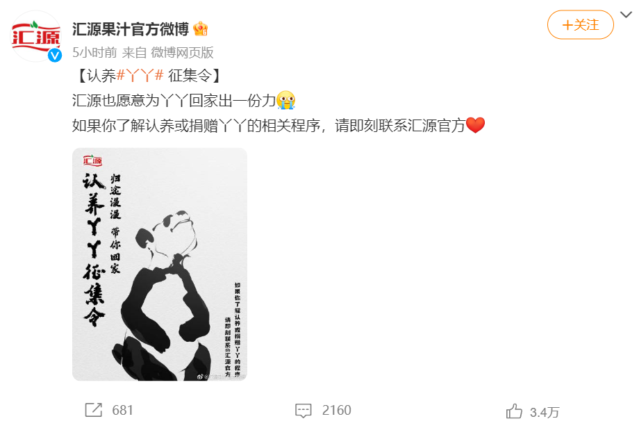 此举引发众多网友讨论。有网友对汇源此举表示支持,也有网友表示,此前已有蜂花在跟进认养“丫丫”事宜,希望汇源可以考虑认养其他大熊猫。