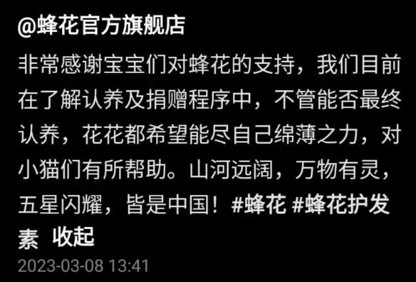 而在昨日(3月8日),蜂花也回应了有关认养大熊猫“丫丫”的相关情况,表示愿意尽力帮助熊猫“丫丫”回国,目前已在了解认养及捐赠程序。