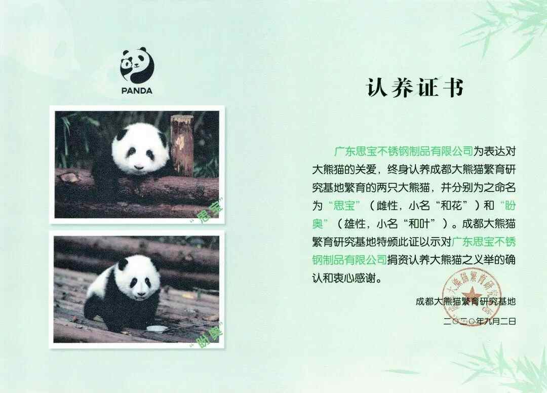 除了“丫丫”,近日,许多网友也关注到大熊猫“和花”“和叶”被认养的消息。据“思宝真空杯”微信公众号显示,广东思宝不锈钢制品有限公司(以下简称“广东思宝”)已在2020年9月2日认养大熊猫龙凤胎姐弟“和花”“和叶”,并再次命名为“思宝”“盼奥”。