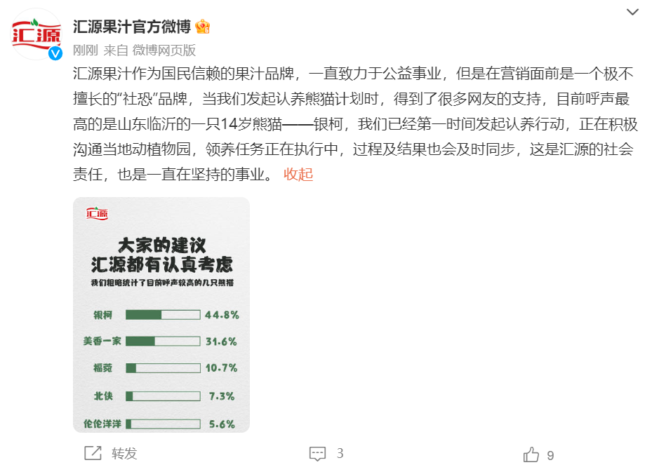 傍晚,汇源果汁作出回应,表示有认真考虑大家的建议,统计了目前呼声较高的熊猫,目前已经在积极与当地动植物园沟通认养事宜。