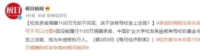 因1100万元的捐赠承诺未履行,中国矿业大学校友吴幽被其母校的教育发展基金会起诉。因有履行能力而拒不履行生效法律文书确定义务,目前吴幽已被江苏省徐州市铜山区人民法院列入失信被执行人名单。