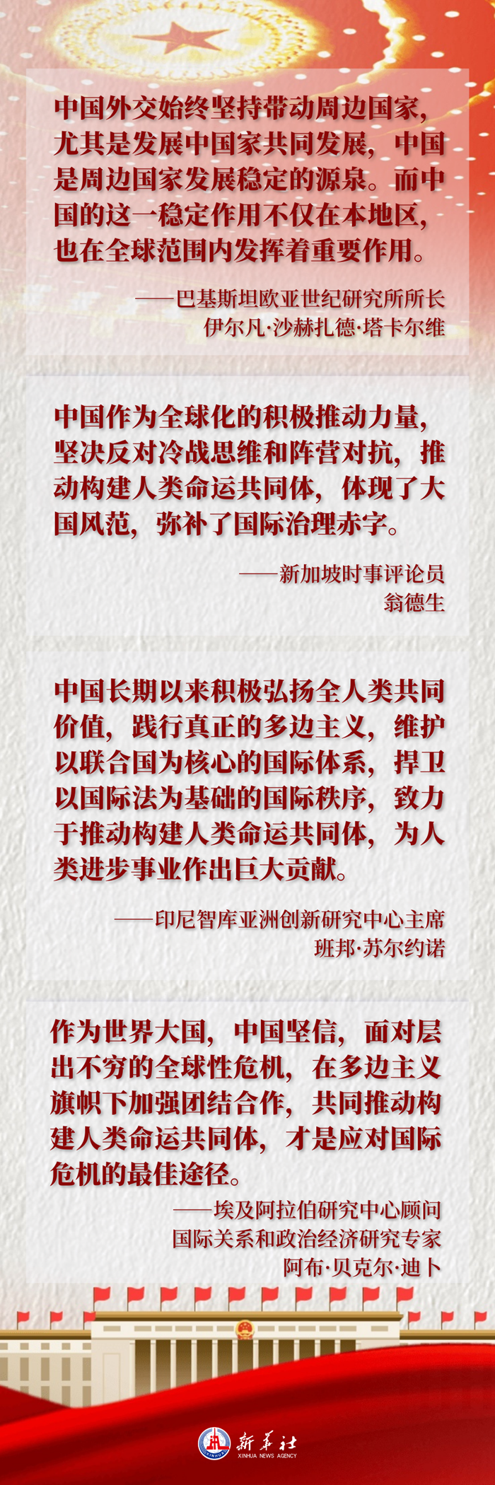 “中国长期以来积极弘扬全人类共同价值,践行真正的多边主义,维护以联合国为核心的国际体系,捍卫以国际法为基础的国际秩序,致力于推动构建人类命运共同体,为人类进步事业作出巨大贡献。”印尼智库亚洲创新研究中心主席班邦·苏尔约诺表示。