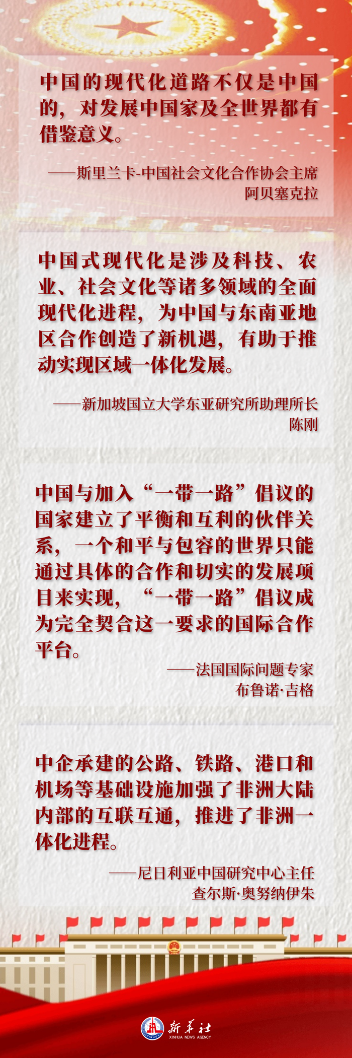 “中国的现代化道路不仅是中国的,对发展中国家及全世界都有借鉴意义。”曾在中国工作生活12年的斯里兰卡-中国社会文化合作协会主席阿贝塞克拉对中国式现代化进程深有体会。他说:“当我们在讨论哪个国家最值得学习的时候,中国是最佳选择。”