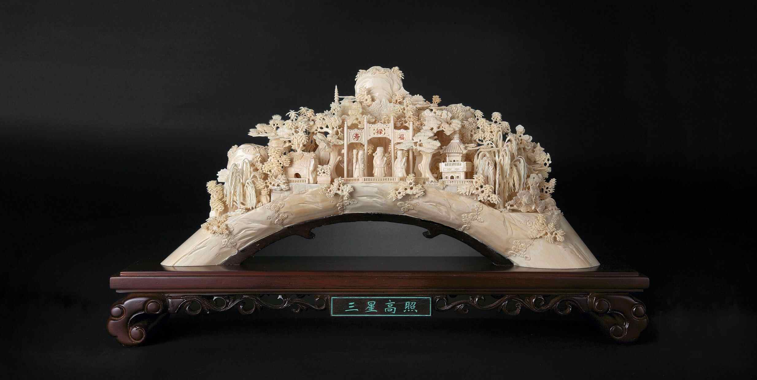 牙雕,国家级非遗项目。广州牙雕以牙质莹润、精镂细刻、玲珑剔透见长,重雕工,有一整套完整的精湛雕刻工艺。因我国加入国际禁止象牙贸易条约,近年来,国内象牙雕刻业采用牛骨等材质延续象牙雕刻技艺,始终保持较高的工艺水平。