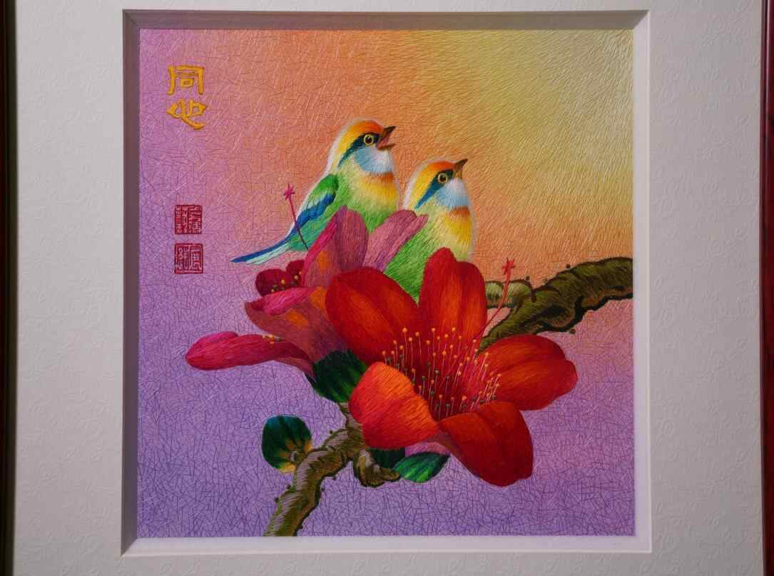 广绣,国家级非遗项目。广绣是珠三角民间刺绣工艺的总称,以构图饱满、形象传神、纹理清晰、色泽富丽、针法多样的艺术特色而闻名。