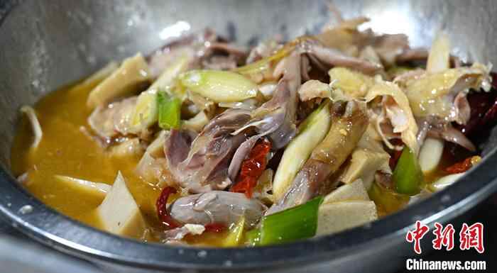 “一天煮一锅,水开后放入花椒、生姜、咸盐,去腥味增香味,我家一锅炖煮80只鸡,足足需要5个小时,刚好到午饭的时候出锅。”每天清晨,沙飞和李霞就开始在店里忙活。