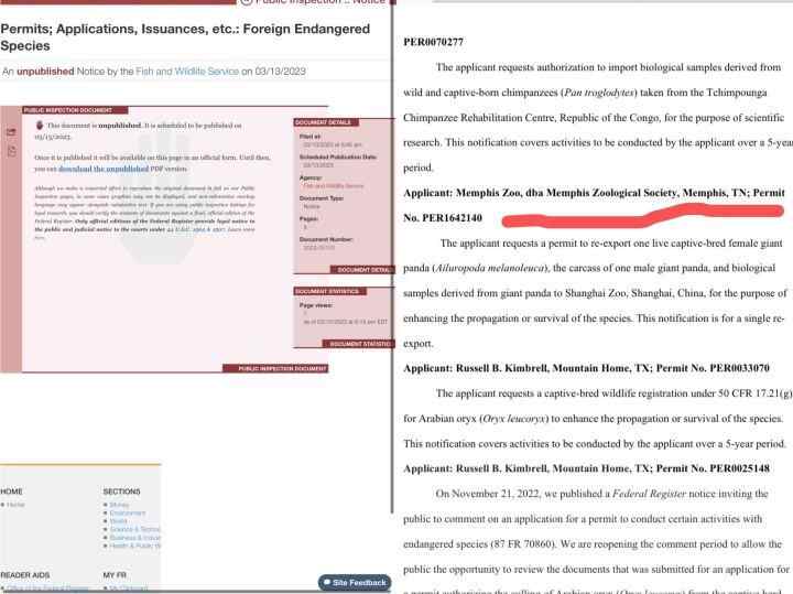 3月11日上午,潮新闻记者登录美国联邦网站搜索到一份非正式公布文件,公布这份文件的机构为美国鱼类及野生动物管理局(United States Fish and Wildlife Service;缩写:USFWS),其中一则的申请人为“孟菲斯动物园”,许可证号码为PER1642140,申请人要求签发许可证,以便将一只圈养繁殖的雌性熊猫,一只雄性大熊猫的尸体,及大熊猫的生物样本转到中国的动物园,以促进该物种的繁殖或生存。并且写到:本通知书只适用于单次再出口。