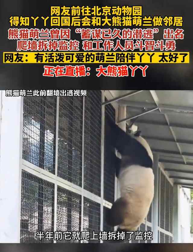 此前海报新闻9日报道,网友前往北京动物园,得知“丫丫”回国后将会和大熊猫“萌兰”做邻居。据了解,熊猫“萌兰”十分活泼外向,曾因“蓄谋已久的潜逃”出名,还爬墙拆掉监控和工作人员斗智斗勇。