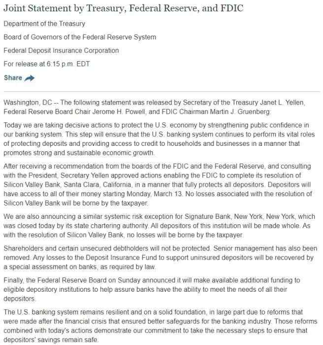 上述声明同时强调,硅谷银行股东和某些无担保债券持有人将得不到保护。高级管理人员也将被撤职。