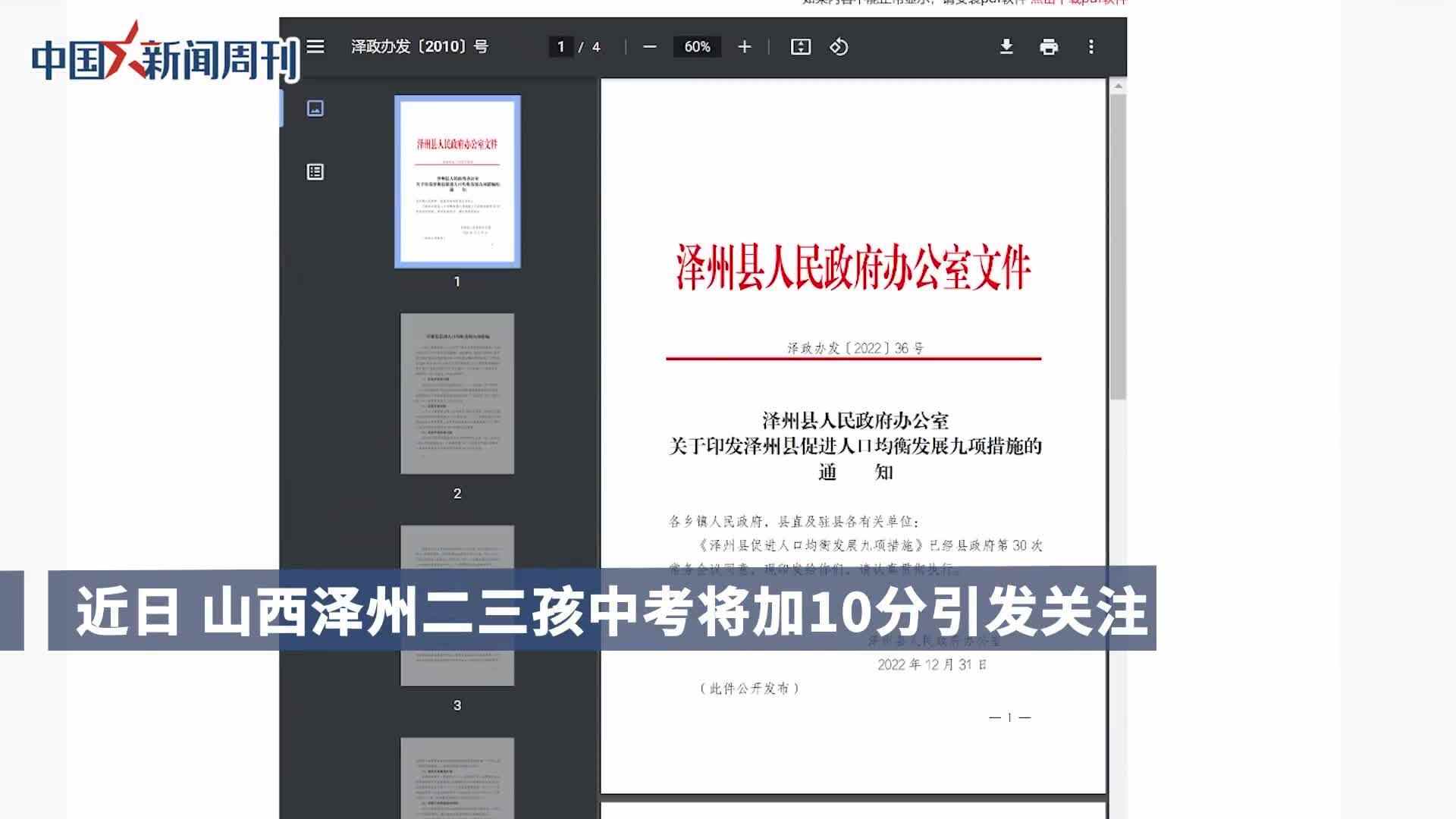 近日,山西泽州二三孩中考将加10分引发关注。《泽州县促进人口均衡发展九项措施》规定,在泽州县落户、就业的二(三)孩家庭子女,中考报考县内公办高中时可加10分。该县卫体局发布的实施细则指出,该措施优惠对象为2023年1月30日之后出生且首次户口登记在泽州县的二(三)孩,父母至少一方为泽州县户口、且在本县就业至少缴纳社保满一年。