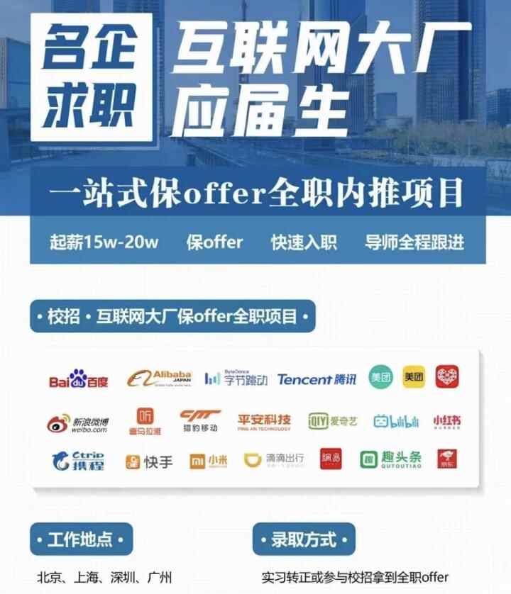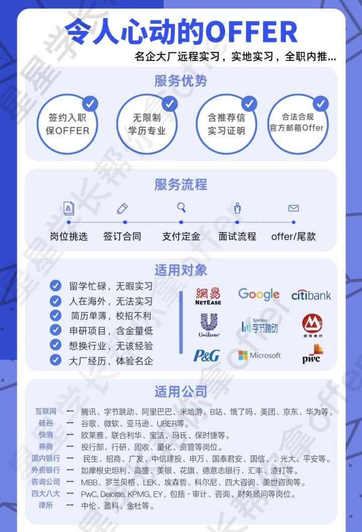从顾先生向记者提供的公司宣传海报看,该公司主营“一站式保offer全职内推项目”,21家国内知名互联网公司包括百度、阿里、字节跳动、腾讯、美团、新浪、小红书、爱奇艺、bilibili等公司。