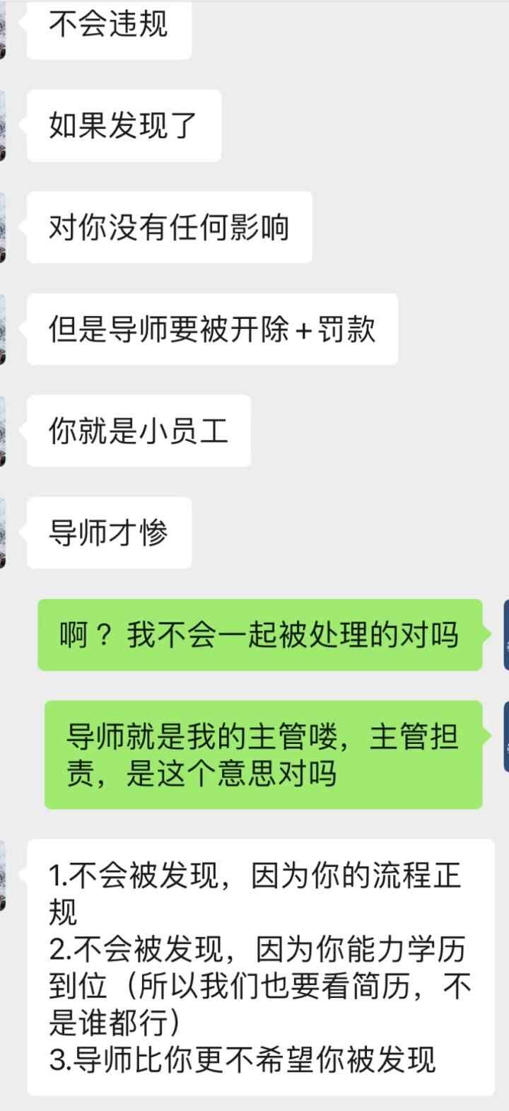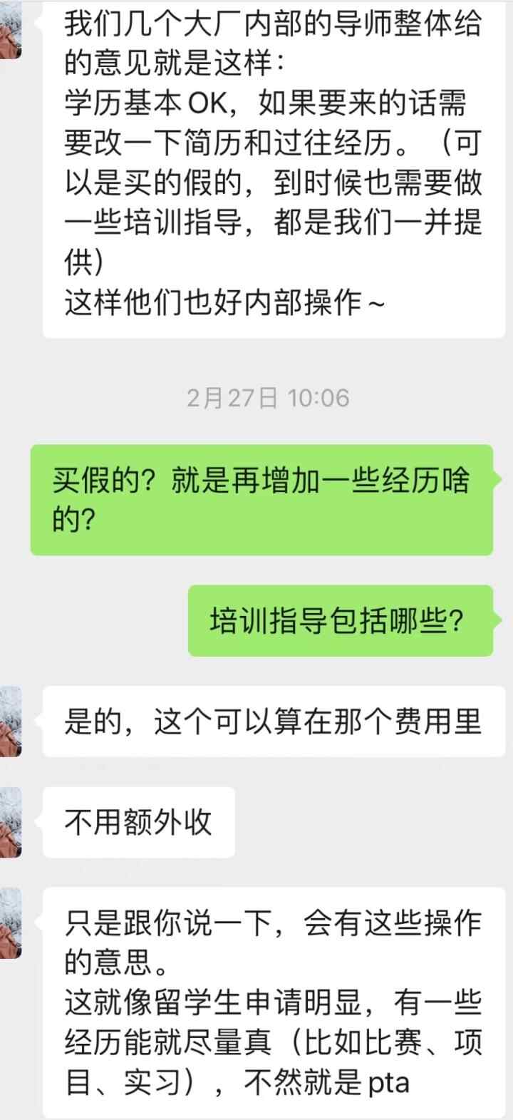 “履历太差的学生我们也推不进大厂,有门槛。”“星星学长”称,从投递简历到面试,皆是走正规校招流程的,一般不会引起HR的质疑。对于部分求职者实践经历不够的情况,公司还会根据其过往经历,在简历上“增添”一些虚构的实习背景。“即使招聘企业要查,我们也可开具相关证明。” “星星学长”表示,简历造假如果被发现,也不会对学生产生任何影响,只有可能是在大厂内部任职的导师面临被公司罚款、开除的惩罚。