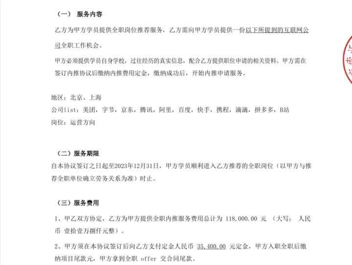 随后,顾先生给记者发来一份求职签约合同——“2023年互联网方向全职内推服务协议”。记者注意到,合同约定服务内容为“为学员提供在美团、字节、京东、腾讯、阿里、百度、快手等互联网公司全职工作机会”。全职内推服务费用为11.8万元,协议签订后支付定金30%,拿到全职offer后付全款,不进则全额退款。