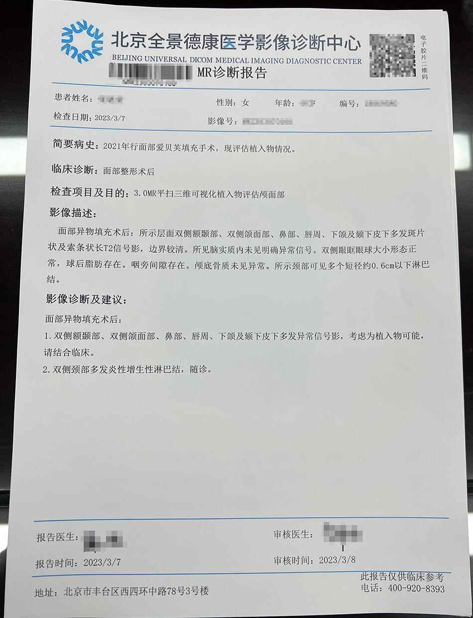 张女士提供的诊断报告显示,面部异物填充后双侧额颞部、双侧颌面部、鼻部、唇周、下颌等皮下多发异常信号影,“考虑为植入物可能”;双侧颈部多发炎性增生性淋巴结。
