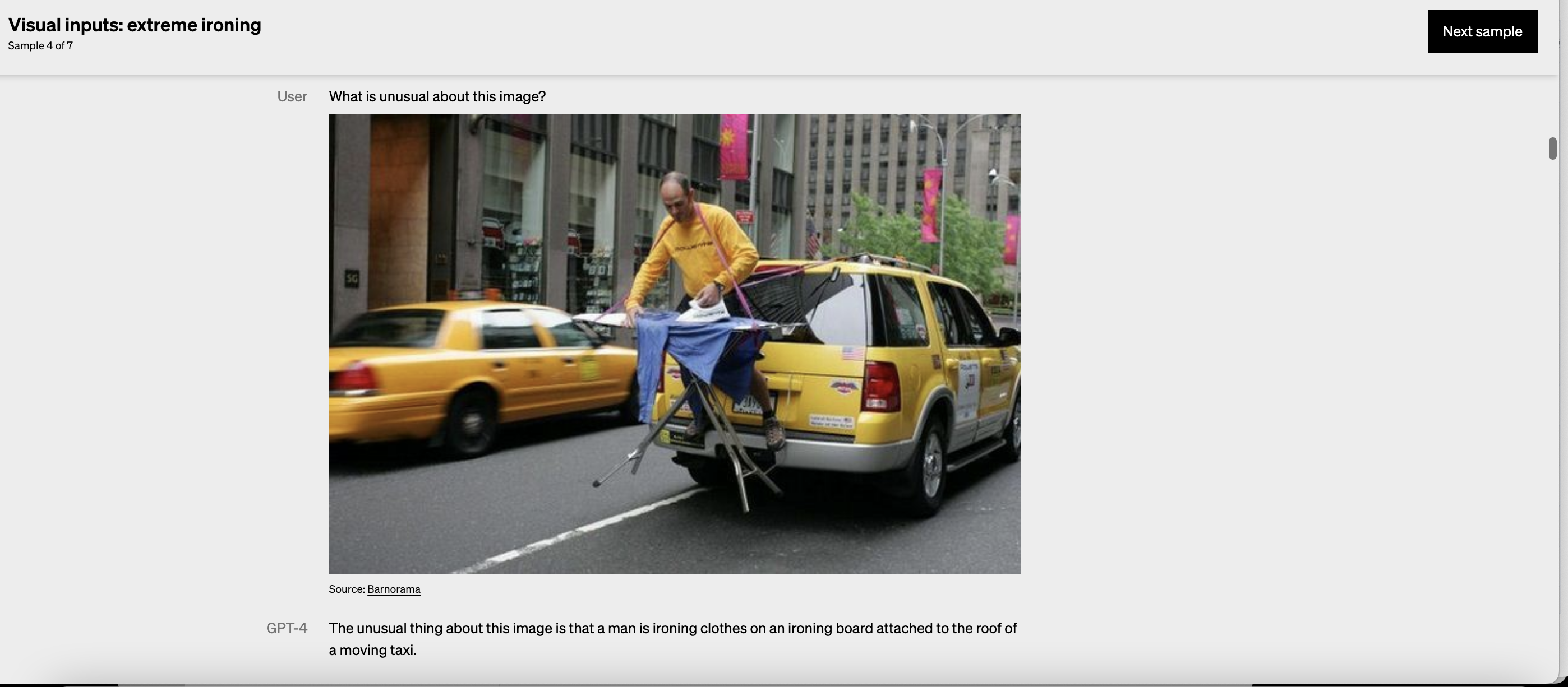 目前图像处理功能还未公开,不过该公司在官网上展示了一系列案例。例如,输入如下图片并询问“这张图片有什么不寻常之处”,GPT-4可作出回答“这张照片的不同寻常之处在于,一名男子正在行驶中的出租车车顶上,使用熨衣板熨烫衣服。”