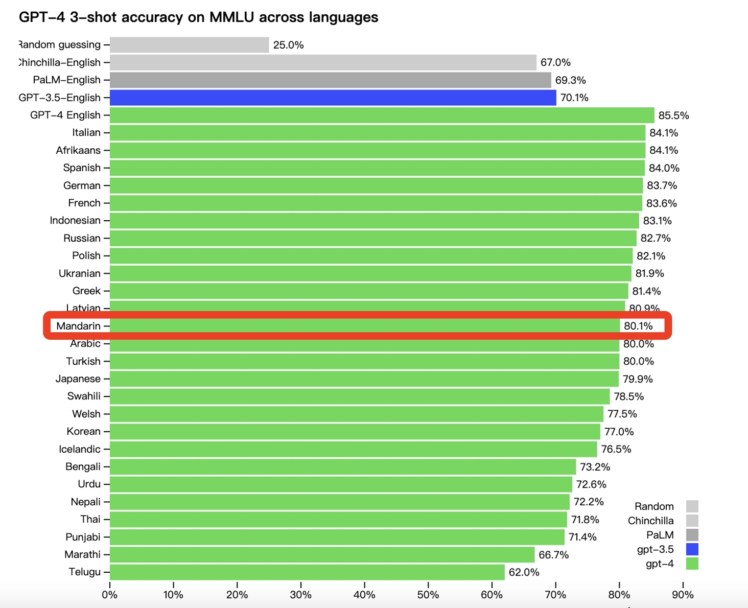 不仅是英语,该模型在多种语言方面均表现出优越性。Open AI称,在测试的26种语言中,GPT-4在24种语言方面的表现均优于GPT-3.5等其他大语言模型的英语语言性能。其中GPT-4的中文能够达到80.1%的准确性,而GPT-3.5的英文准确性仅为70.1%,GPT-4英文准确性提高到了85.5%。