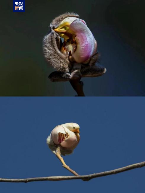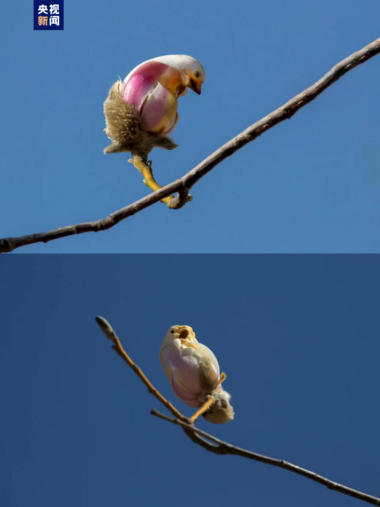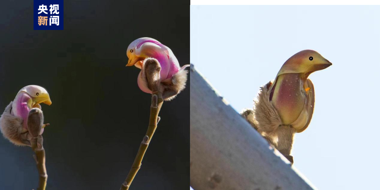在北京昌平区的大运河源头遗址公园,含苞待放的玉兰花像小鸟跃上枝头,让人花鸟难辨。市民给这些形态特殊的玉兰花起名“玉兰鸟”。
