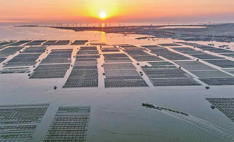 近年来,山东省荣成市大力推行科技兴海、以养兴渔,积极推广“浅海多营养层次生态养殖模式”。图为石岛管理区桑沟湾海洋牧场网箱养殖区(2023年2月16日摄)。 人民图片 李信君/摄