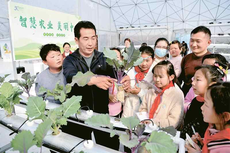 近年来,安徽省亳州市通过“公司+基地+农户”的方式,大力发展休闲观光农业,扎实推动乡村振兴。图为2023年3月4日,工作人员在智慧农业产业园内为参观者讲解有关技术。 人民图片 刘勤利/摄