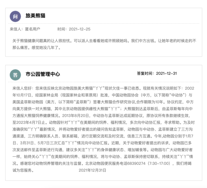 早在2021年,该中心曾在官网“领导信箱”中回应关于旅美大熊猫“丫丫”的情况。记者梳理发现,2021年12月31日是该部门最近一次回应网友关于“丫丫”现状欠佳一事,回应称,为及时准确获知“丫丫”最新情况,并将动物爱好者提出的疑问告知孟菲斯,北京动物园与中动协、孟菲斯建立了三方沟通渠道,三方明确联系人员、联系邮箱,进行定期交流和及时交流,信息三方互通。