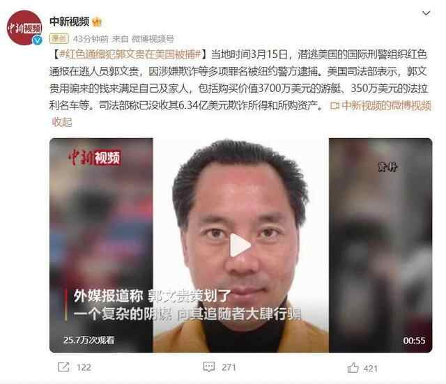 当地时间3月15日,潜逃美国的国际刑警组织红色通报在逃人员郭文贵,因涉嫌欺诈等多项罪名被纽约警方逮捕。美国司法部表示,郭文贵用骗来的钱满足自己及家人,包括购买价值3700万美元的游艇、350万美元的法拉利名车等。司法部称已没收其6.34亿美元欺诈所得和所购资产。